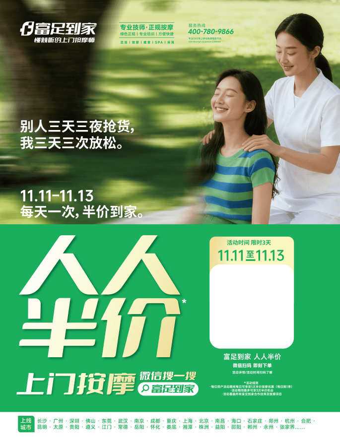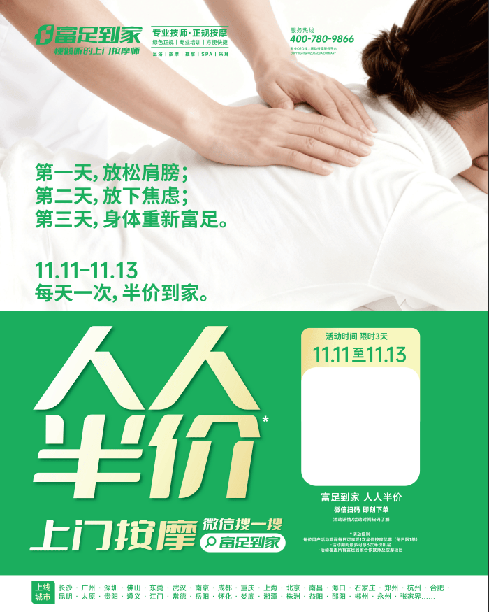 “我们希望通过限时折扣活动,让更多人以亲民价格体验到专业上门按摩的便捷与舒适,将健康养生融入日常生活。”富足到家市场部负责人表示,平台始终以“专业、安全、便捷”为核心使命,此次双11特惠不仅是对新老用户的感恩回馈,更是推动上门健康服务普及的重要举措。未来,富足到家将持续优化技师团队与服务网络,为消费者带来更优质的养生体验。